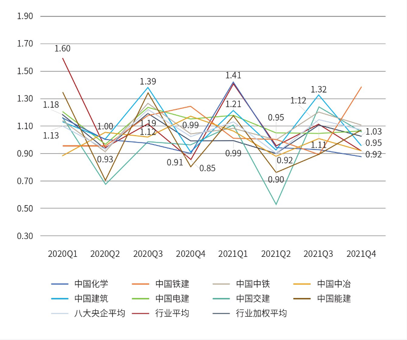 图4 2020-2021 年各季度八大建筑央企经营现金流流入与营业收入比值变化趋势
